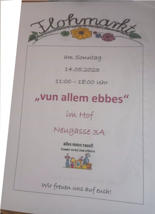 Flohmarkt – vun allem ebbes Flohmarkt – vun allem ebbes im Hof, Neugasse 3A 14.05.2023 von 11:00 bis 18:00 Uhr